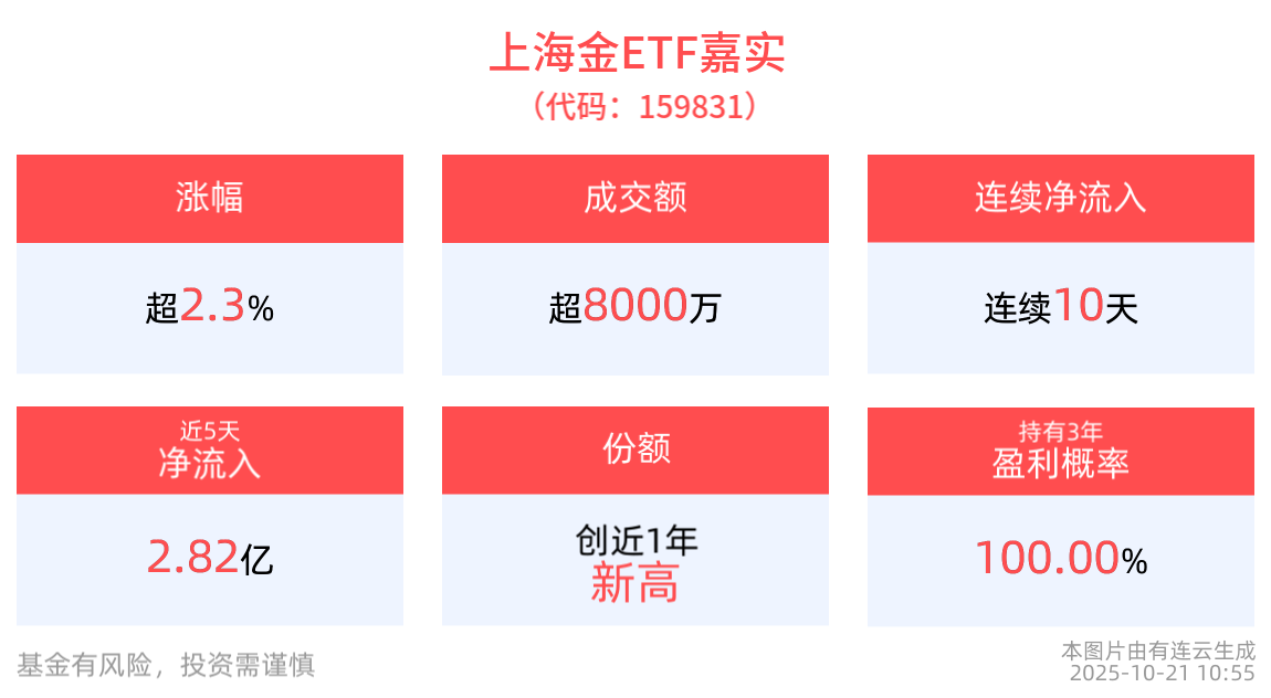 1.打开上海金ETF嘉实(159831)盘中涨超2.3%,机构:黄金长期避险和投资价值日益凸显场内ETF方面,截至2025年10月21日 10:55,上海金ETF嘉实(159831)上涨2.33%。拉长时间看,截至2025年10月20日,上海金ETF嘉实近1周累计上涨4.63%。,进入上海金ETF嘉实(159831)盘中涨超2.3%,机构:黄金长期避险和投资价值日益凸显场内ETF方面,截至2025年10月21日 10:55,上海金ETF嘉实(159831)上涨2.33%。拉长时间看,截至2025年10月20日,上海金ETF嘉实近1周累计上涨4.63%。前加载界面。